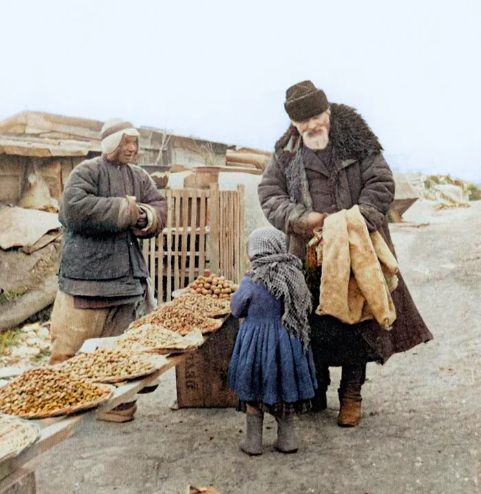 Дедушка с внучкой выбирают орехи, 1903 год.