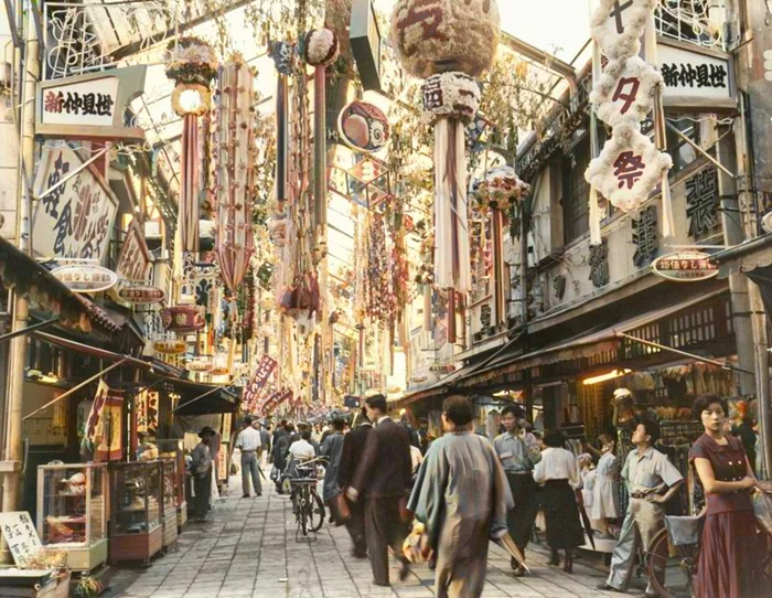 Украшенная улица в Токио, Япония, во время праздника Танабата, 1954 год.