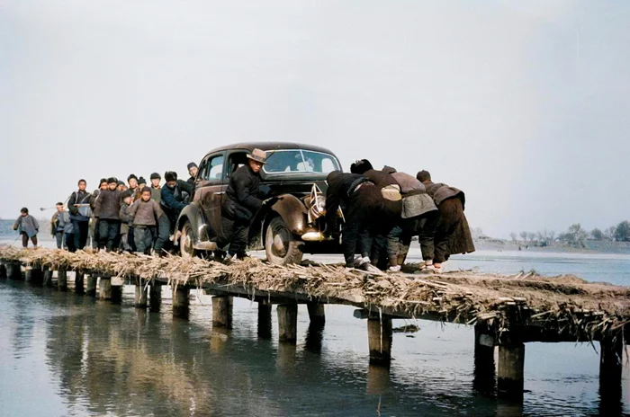 Китайцы помогают делегации из Великобритании проехать по мосту.
