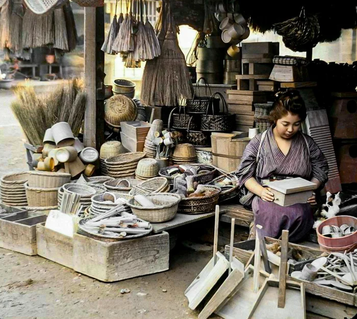 Девушка продаёт деревянную домашнюю утварь. Япония, 1898 год.
