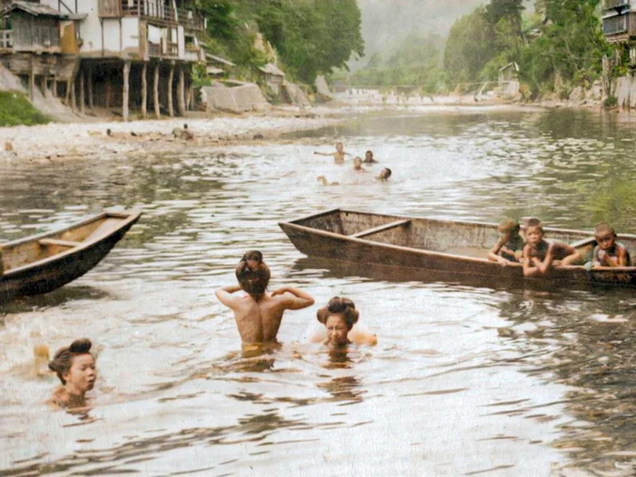 Люди купаются в реке в летнюю жару. Япония, 1915 год.