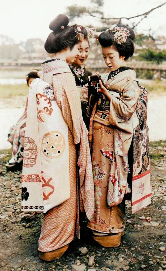 Ещё одна фотографии японский Майко (на японском танцующее дитя). До принятия закона о детском труде майко становились в 9-12 лет. Завершив обучение правилам приёма гостей, ученица гейши начинала карьеру.