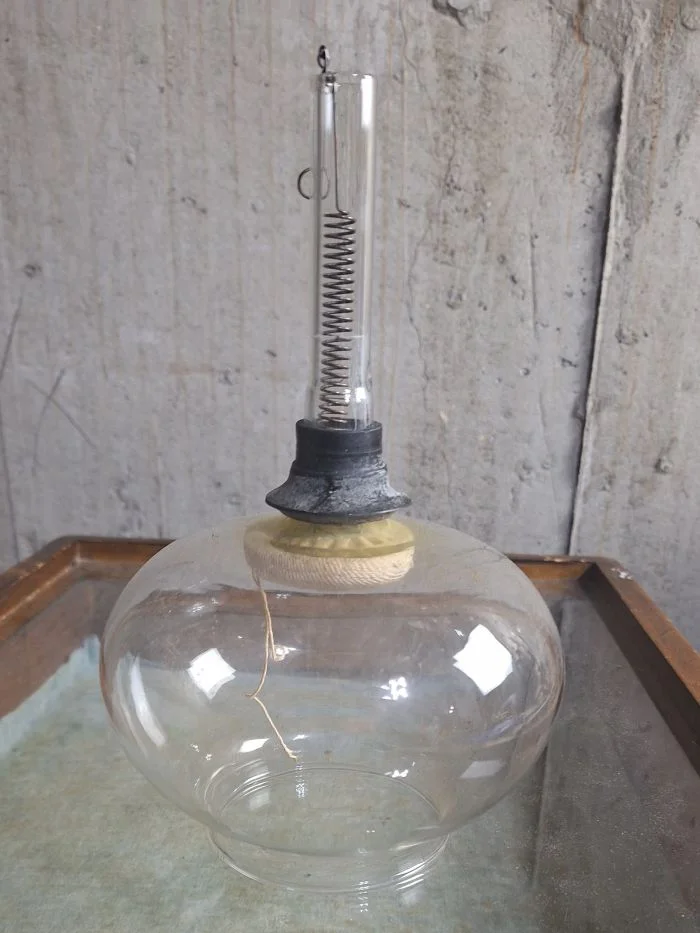 2. Стеклянная небольшая чаша без дна размером с трубкой длиной 13 сантиметров, содержащей пружину, прикрепленную к волокнистому вкладышу внутри чаши. Маленькое отверстие сбоку трубки