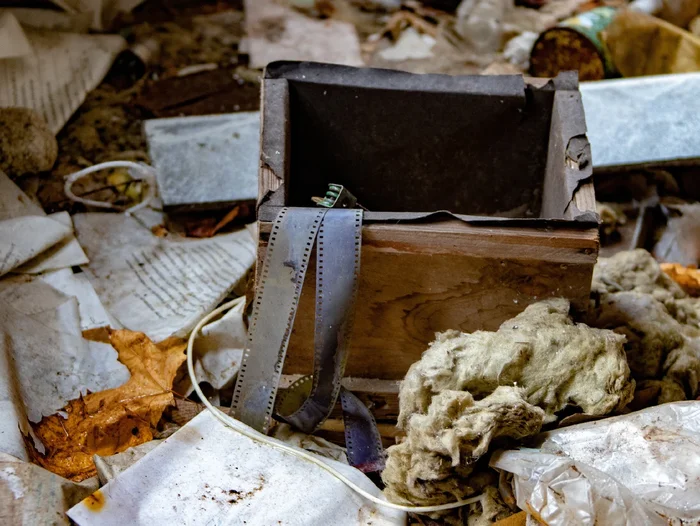 Внутри разруха, но еще сохранились остатки неведомых приборов, рулоны фотоплёнок и радиодеталей.