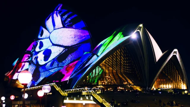 Vivid Sydney — это ежегодный фестиваль света, музыки и идей, проходящий в Сиднее. Одним из самых известных событий фестиваля является Lighting the Sails — проекция световых шоу на паруса здания Сиднейского оперного театра. Таким было оформление в 2017 году.