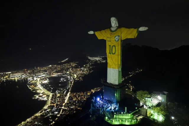 [/centerСтатуя была подсвечена изображением футболки сборной Бразилии с 10-м номером в память о Пеле, легенде футбола, в первую годовщину его смерти.