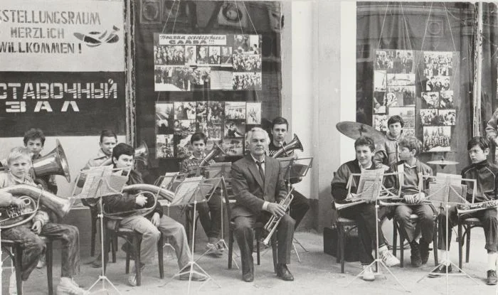 14. Детский духовой оркестр под руководством М.З. Пиастро у здания Городского центра досуга в Евпатории.