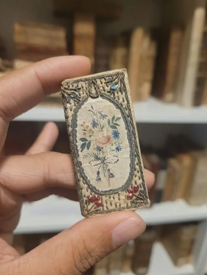 Очаровательный миниатюрный альманах с вышитой обложкой, выпущенный во Франции около 1780 года. Размер всего 3 x 7 см.