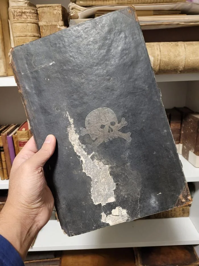Missa in Agenda Defunctorum, 1733. Месса о мёртвых начала XVIII века, содержащая песнопения для заупокойной мессы, которые священник должен был использовать у алтаря. Переплёт с черепом и скрещенными костями.