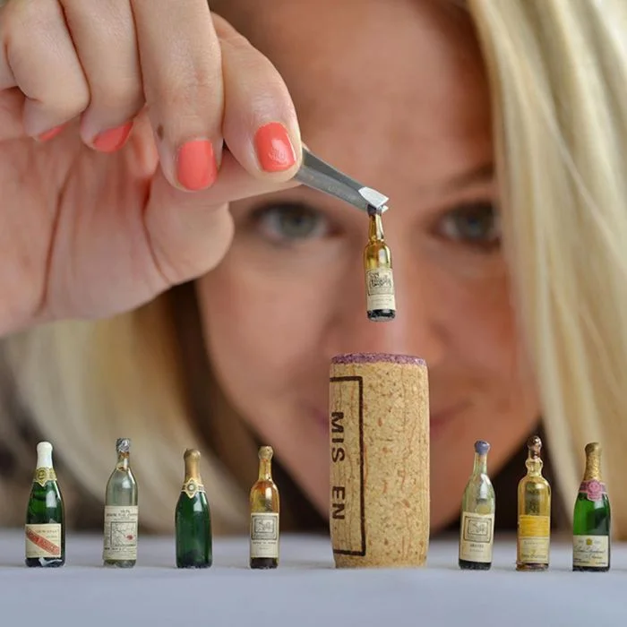 Бутылки с вином и шампанским 1920-х годов были созданы в масштабе 1/12, наполнены нужным содержимым с помощью крошечной пипетки, закупорены пробками и снабжены соответствующими этикетками для погреба кукольного дома королевы Марии.