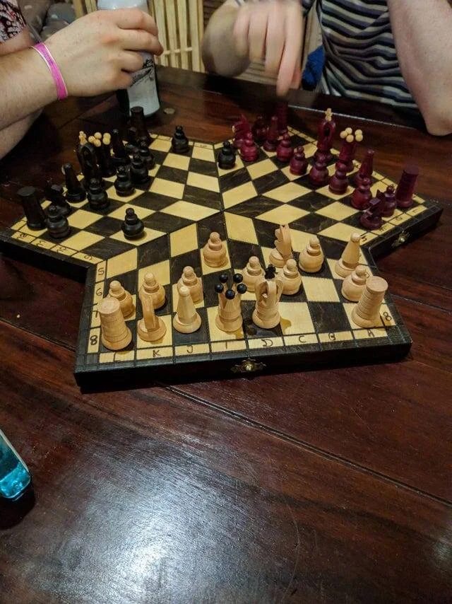 В нашем отеле есть шахматная доска, на которой можно играть втроём