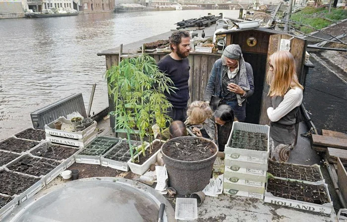 Продавец саженцев конопли на своей лодке. Канал Оостербургерграхт, Амстердам, 1971 год.
