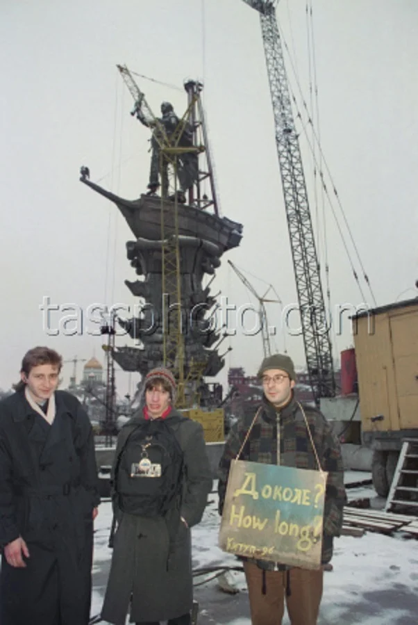 Молодые художники - члены "Фонда развития культуры и науки" на акции протеста против деятельности скульптора Зураба Церетели. Участники акции считают что уровень работ Зураба Церетели не соответствует духу древней Российской столицы. Москва, 1996 год.