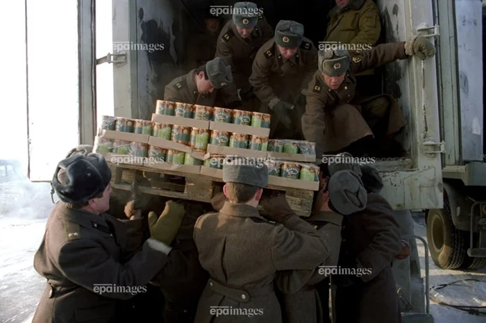 Российские солдаты выгружают ящики с французской продовольственной помощью в аэропорту Читы. Более 100 тонн продовольствия были пожертвованы людьми из французского города Брест и были направлены нуждающимся в детские дома и больницы. Чита, 1992 год.