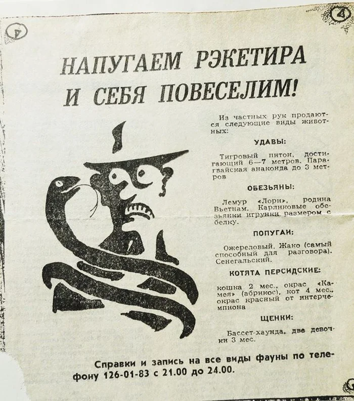 Объявления о продаже редких домашних животных, 1990-е годы.
