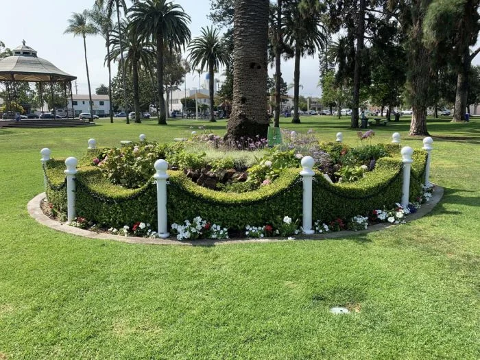 Кусты подстрижены так, чтобы их форма совпадала со свисающей цепью
