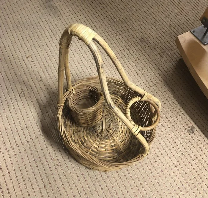 8. Нашла в комиссионном магазине. Плетёная корзина с отверстием в ручке и плетёной корзинкой поменьше внутри