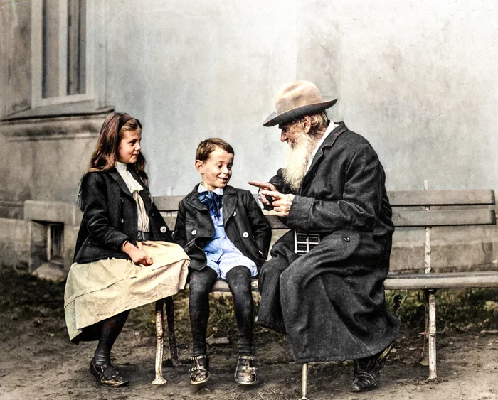 Толстой со своими внуками С.А. и И.А. Толстыми. Крекшино, Московская губерния, 1909 год.
