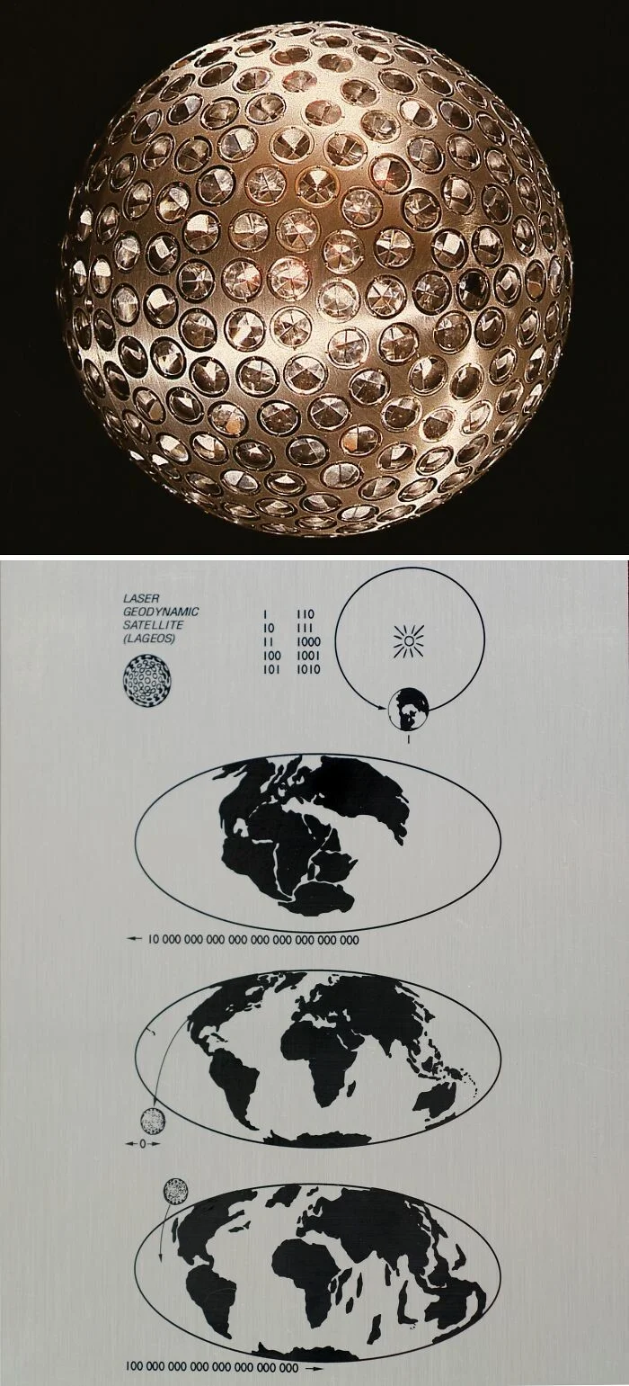 LAGEOS-1 запущен НАСА в 1976 году и, по прогнозам, вернётся в атмосферу через 8,4 млн лет. Внутри него есть табличка с информацией для будущего человечества.Вверху слева - изображение спутника LAGEOS-1. Затем представлены числа от 1 до 10 в двоичном коде и схема, изображающая орбитальное движение Земли вокруг Солнца. Под схемой указано число 1, означающее единицу времени (1 год) для нижеследующих схем. Стрелка вправо на орбите Земли означает выбранное направление временной шкалы (слева прошлое, справа будущее). Ниже показаны три карты Земли - с расположением континентов около 270 миллионов лет назад, с их расположением на момент запуска и с предположительным расположением континентов через 8,4 миллиона лет после запуска. Под первым рисунком записано число в двоичном коде - единица с 28 нулями (в десятичном коде оно равно 268 435 456), и стрелка, указывающая налево, что должно означать "до запуска спутника". Под вторым рисунком нанесён ноль (то есть современность по шкале времени), на карте отмечено место, откуда был запущен спутник. Под третьим рисунком написано число 100 000 000 000 000 000 000 000 (в десятичной записи оно равно 8 388 608). На этом рисунке схематически показано падение на Землю спутника.