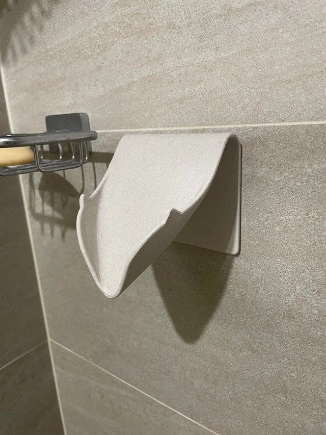 Это держатель для мыла. Наклон нужен для стока воды, благодаря которому мыло не впитывает воду и не превращается в кашу. Благодаря конической форме с загнутыми краями мыло будет держаться там до последнего.