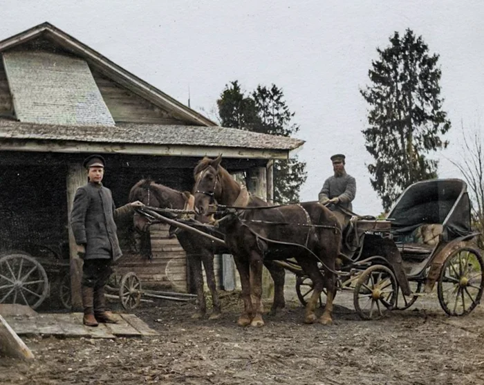 Конюх Иван Байков (слева). Позади сарая проглядывает шпиль башни главного дома.