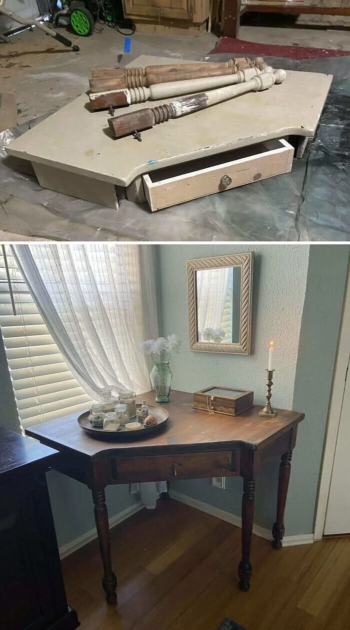 4. Нашёл этот старинный угловой стол в мусоре, снял с него три слоя ужасной краски и покрасил его