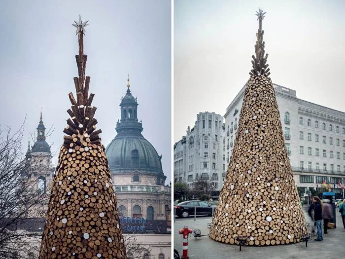 Дровяная ёлка высотой 11 метров была собрана из 5 тысяч поленьев на одной из центральных площадей в Будапеште.