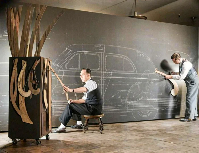 Дизайнеры создают Chevrolet Fleetline sport sedan, США, 1942 год.