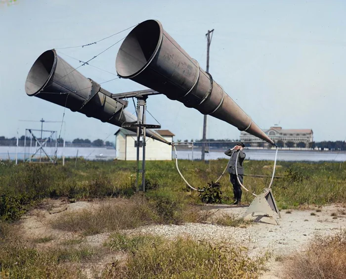 Испытание двухрупорного акустического локатора на военной территории Боллинг Филлд, рядом с Национальным военным колледжем (на заднем плане). Так американские военные мониторили свое воздушное пространство еще меньше ста лет назад.