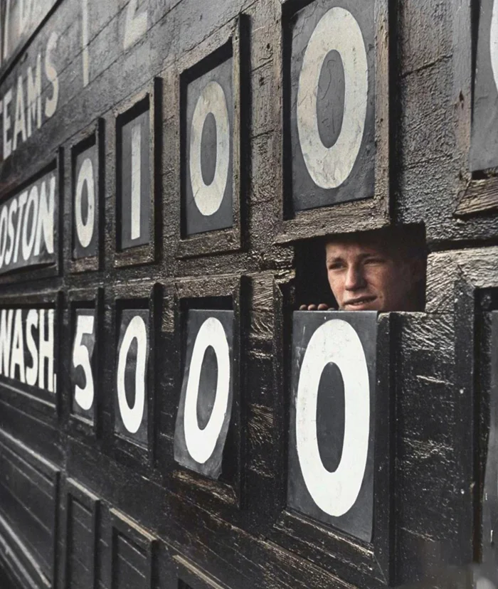 Мальчик, управляющий табло на стадионе Гриффит, выглядывает в щель во время бейсбольного матча. Вашингтон, округ Колумбия, июль 1956 года.