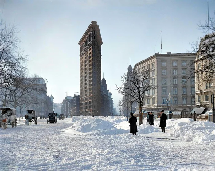 На фотографии 22-ух этажный небоскреб Flatiron Building, что в переводе «здание-утюг». Такое название он получил из-за своей формы. Построили здание в 1902 году.