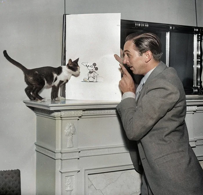 Американский художник-мультипликатор и основатель компании Disney Уолт Дисней показывает коту прототип Микки Мауса, 1931 год.