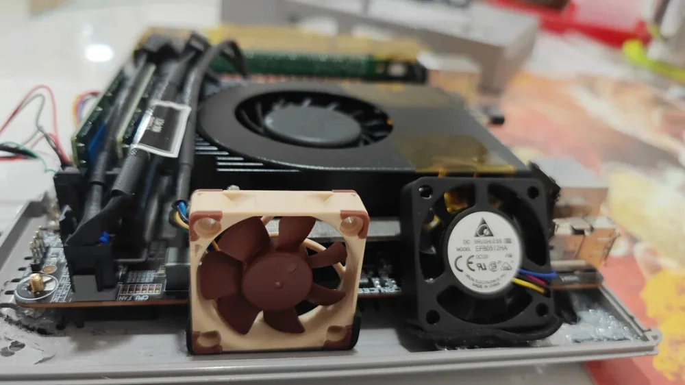 Для проекта были задействованы материнская плата Gigabyte A520i Dash DC, процессор Ryzen 7 5700X, 32 ГБ оперативной памяти, SSD-накопитель Lexar 790 на 2 ТБ, серверный кулер и модифицированный графический процессор GeForce RTX 4060 Mobile. Система дополнительно охлаждается тремя вентиляторами.
