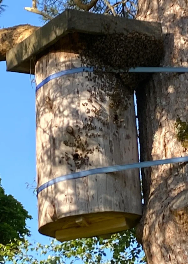 Это улей-ловушка для пчел. Весной рой часто отправляет пчел на разведку, чтобы создать еще одну семью. Лучше повесить на дерево такой псевдо-улей, и потом унести его куда надо, чем искать новосозданный рой по всей территории.