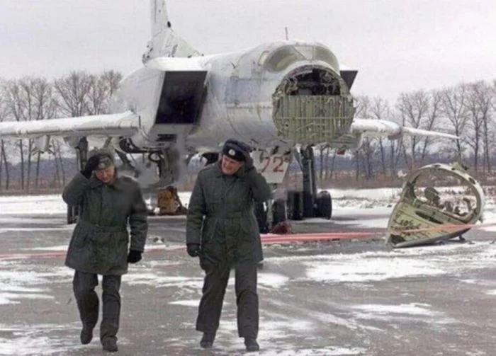 25. Члены экипажа Ту-22М после прощания со своим бортом, который был уничтожен по программе о сокращении стратегических наступательных вооружений