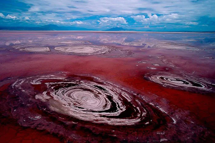 Щелочное озеро Натрон, одно из многих в Великой Рифтовой долине. Несмотря на едкий состав воды (а слово "натр" означает "щёлочь", от него произошло название элемента "натрий), озеро обитаемо. Красный цвет ему придают цианобактерии, которые питаются при помощи фотосинтеза, а красный пигмент является в этом процессе вспомогательным.