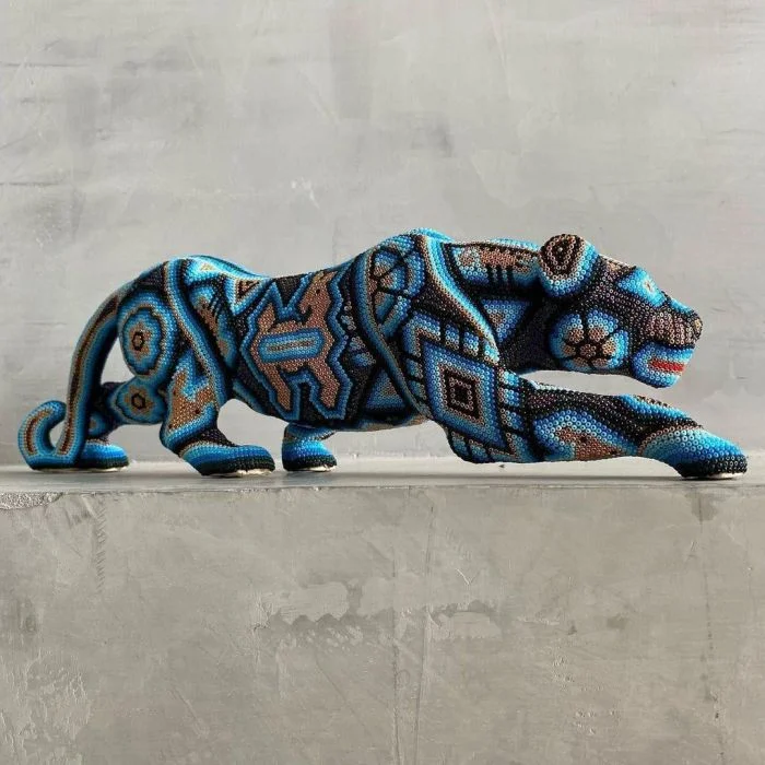 5. Деревянная скульптура ягуара, украшенная сверкающими хрустальными бусинами, притягивает взгляд и поражает сложностью исполнения.