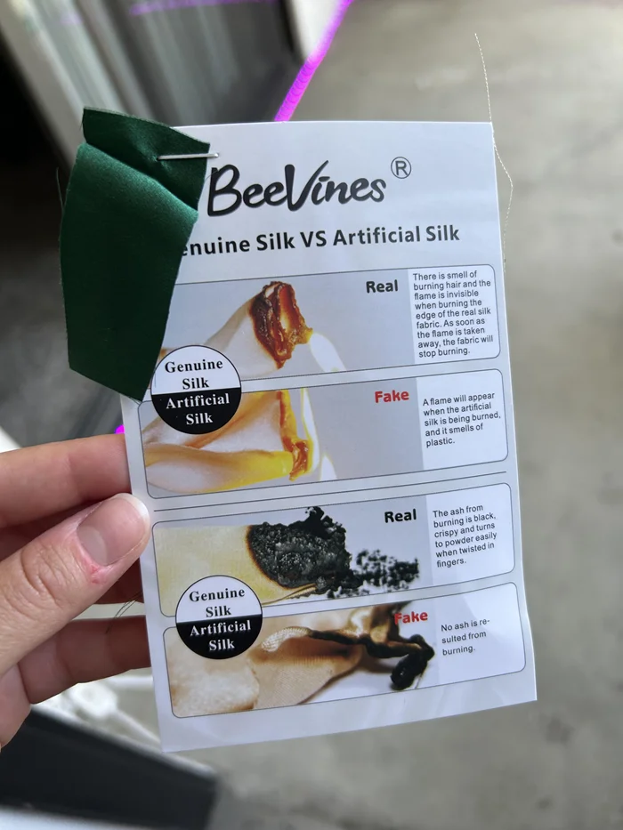 Это тестовый кусочек ткани из того же материала, что и подушка, чтобы можно было посмотреть, как моющие средства повлияют на такую ткань до стирки самой подушки. Вот, к примеру, компания прислала кусочек шелка для сжигания для проверки оригинальности -