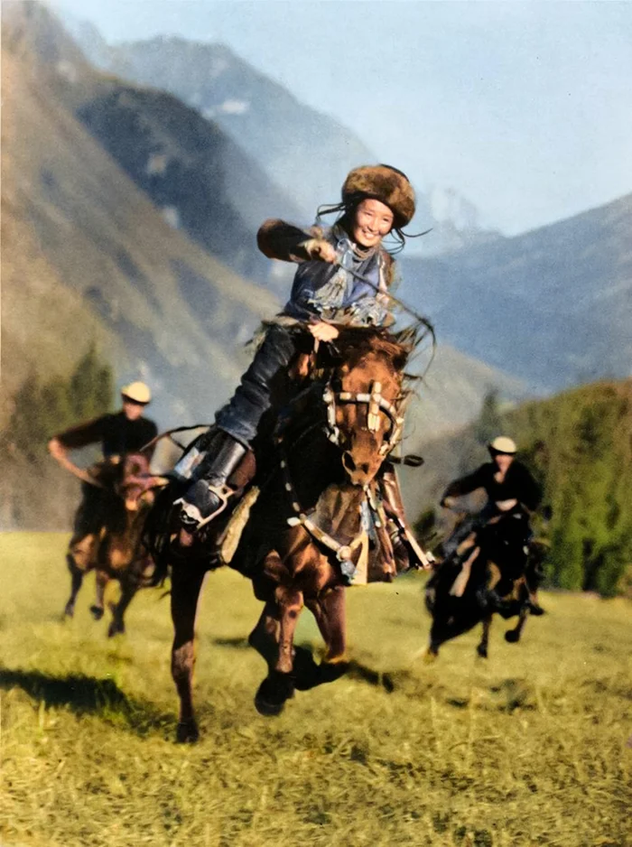 Киргизская девушка-джигитка обгоняет соперников на скачках, 1936 год.