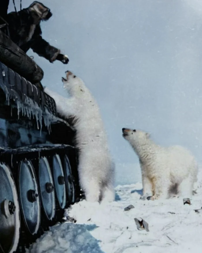 Солдаты кормят белых медведей сгущёнкой, СССР, 1950 год.
