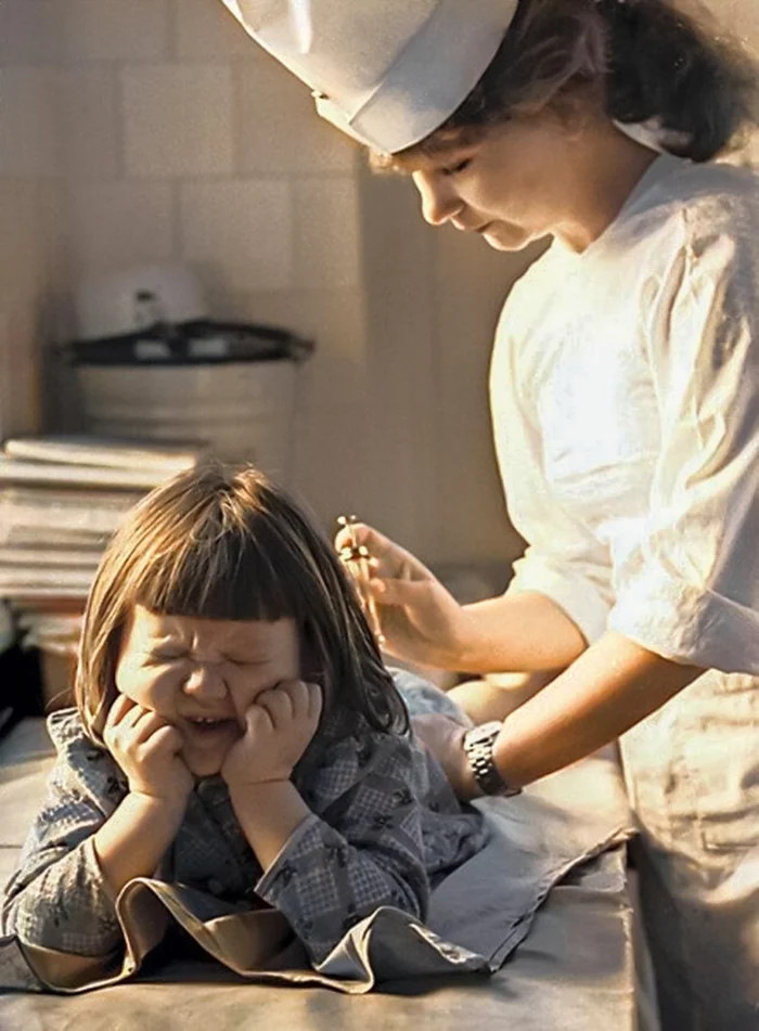 Медсестра, делающая девочке болючий укол. СССР, 1980-е.