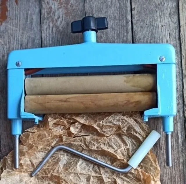 Во времена, когда не было центрифуг, а отжима у машинок и подавно, к ним можно было прикрутить вот такое приспособление. По внешнему виду, оно, конечно, напоминает машинку для раскатки теста, но оно предназначалось для отжима постиранных вещей.