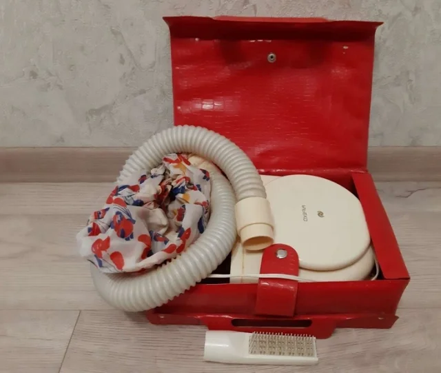 А это фен с шапочкой-сушуаром, который надевался на голову, чтобы побыстрее просушить, например, накрученные на бигуди волосы. Он обычно еще был с ремешком, чтобы можно было с ним ходить по квартире и делать какие-то дела, а не сидеть и ждать, пока волосы высохнут.