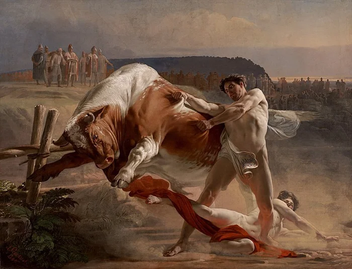 Евграф Сорокин "Ян Усмошвец останавливает быка, при владении Россиею великого князя Владимира" (1849)