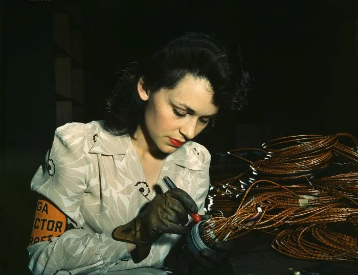 5. Работница американской корпорации Vega осматривает электропроводку самолёта, июнь 1942
