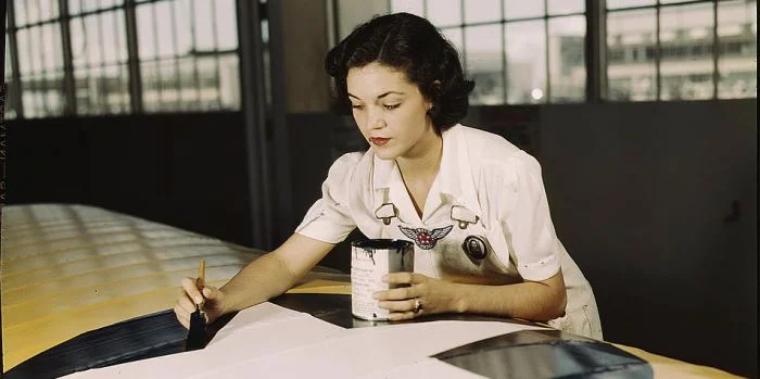 10. Миссис Ирма Ли Макэлрой, бывшая офисная работница, с точностью и искренним патриотизмом наносит американские опознавательные знаки на самолёт, штат Техас, США, август 1942