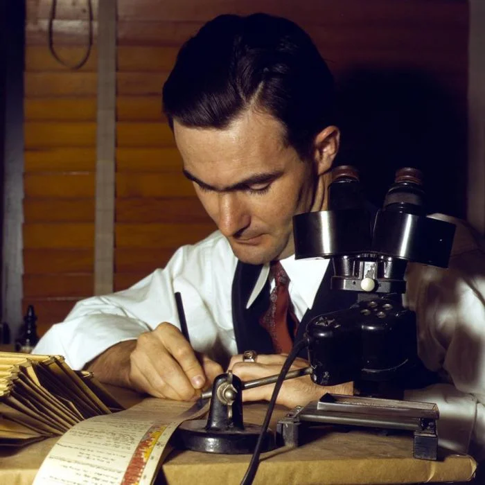 23. Геолог изучает шлам из скважины, Амарилло, Техас, 1943