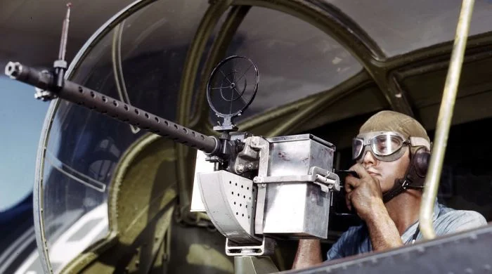 25. Джесси Роудс Уоллер испытывает пулемёт 30-го калибра, который он только что установил на боевой самолёт ВМС США на базе, Корпус-Кристи, Техас, август 1942
