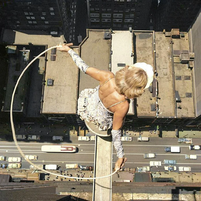 Гимнастка Бетти Фокс прыгает через скакалку на небоскребе высотой в 20 этажей. Чикаго, штат Иллинойс, 1955 год.