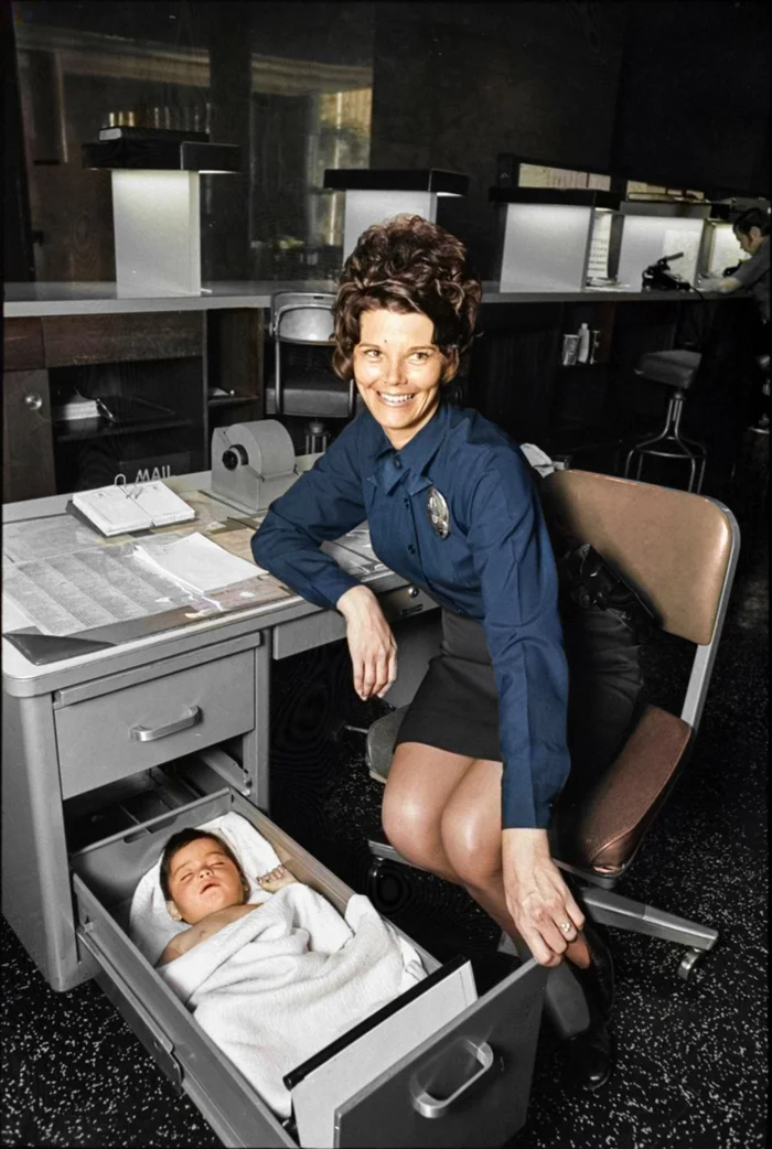Полицейская Пэт Джонсон, ухаживает за девочкой, примерно 9 месяцев, которая была найдена одна и плачущей в номере отеля в центре города.